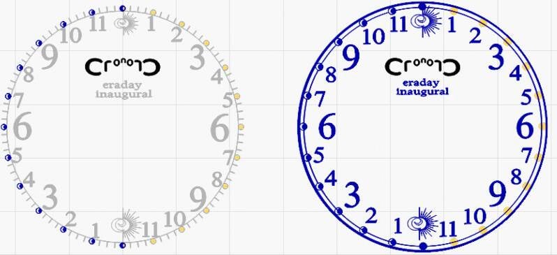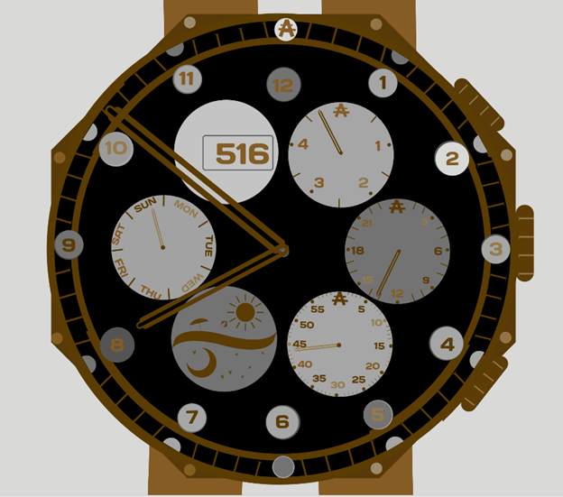 Chronographs within the circles gives an opportunity to show the epoch calendar, local time, date, day, month, a countdown to the next epoch in 5 days as well as hours of each day.