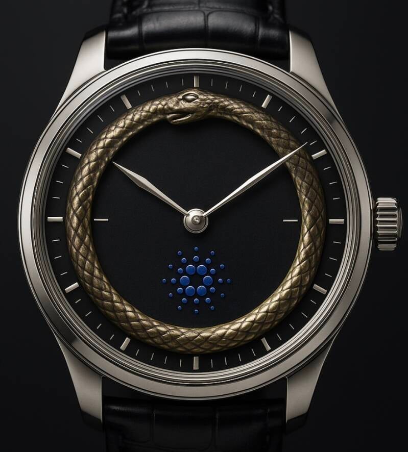Here the Cardano logo is used to tell local time with the hours and minutes included in the 2 outer smaller circles of the logo
